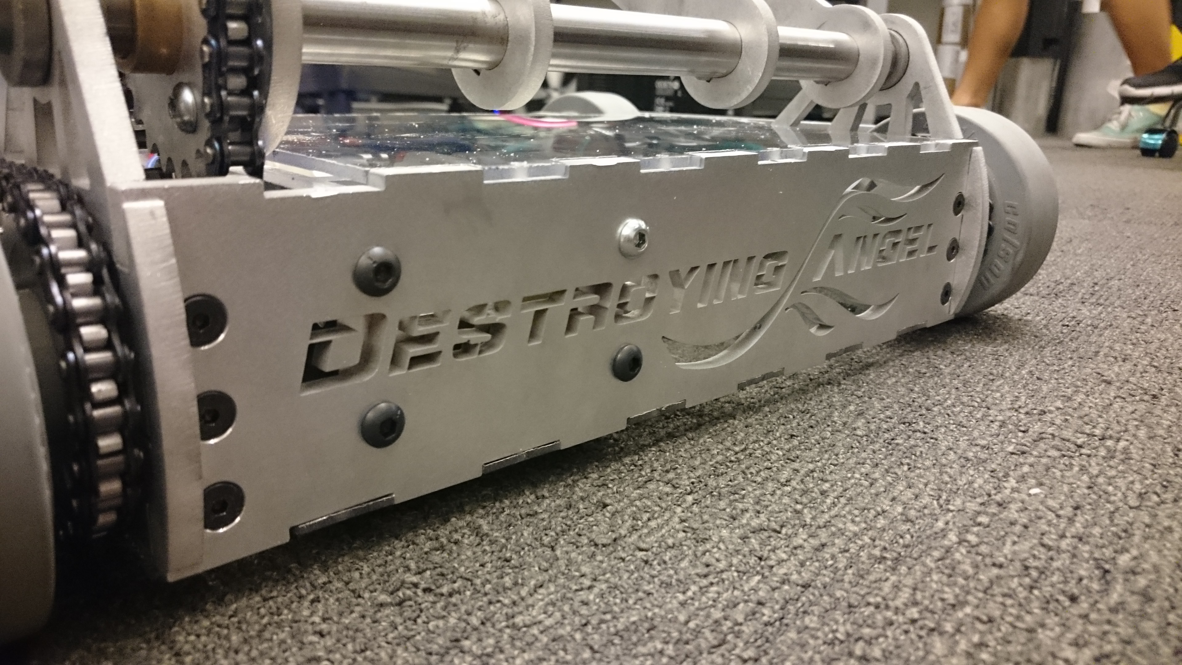 Destroying Angel was assembled in the last day or so before we left for Dragoncon, which is an annual Sci-Fi convention in Atlanta, Georgia. While down in Georgia, we discovered that my basement was a pretty good place to practice driving and actuating the bot. Driving around on the dusty concrete floor was much harder than driving on the carpeted arena floor, which was good for us. We were also able to discover and quickly fix a few bugs and mishaps. The first of which was getting finer control (and less trigger-happy) on the weapon- after slamming into the ground several times, we managed to shear the sprocket on the motor in half (Luckily, we’d brought spares. Always bring spares.). It was also immediately apparent during driving practice that the bot wasn’t driving as we had initially expected. As it turns out, drill motors move a lot more efficiently in the forward direction than in reverse, and so with the drive configured as it was, pushing straight forward on the joystick meant that the bot would slowly turn while moving forwards. Of course, that was just another quirk to get used to, as remaking the drive at that point wasn’t an option.