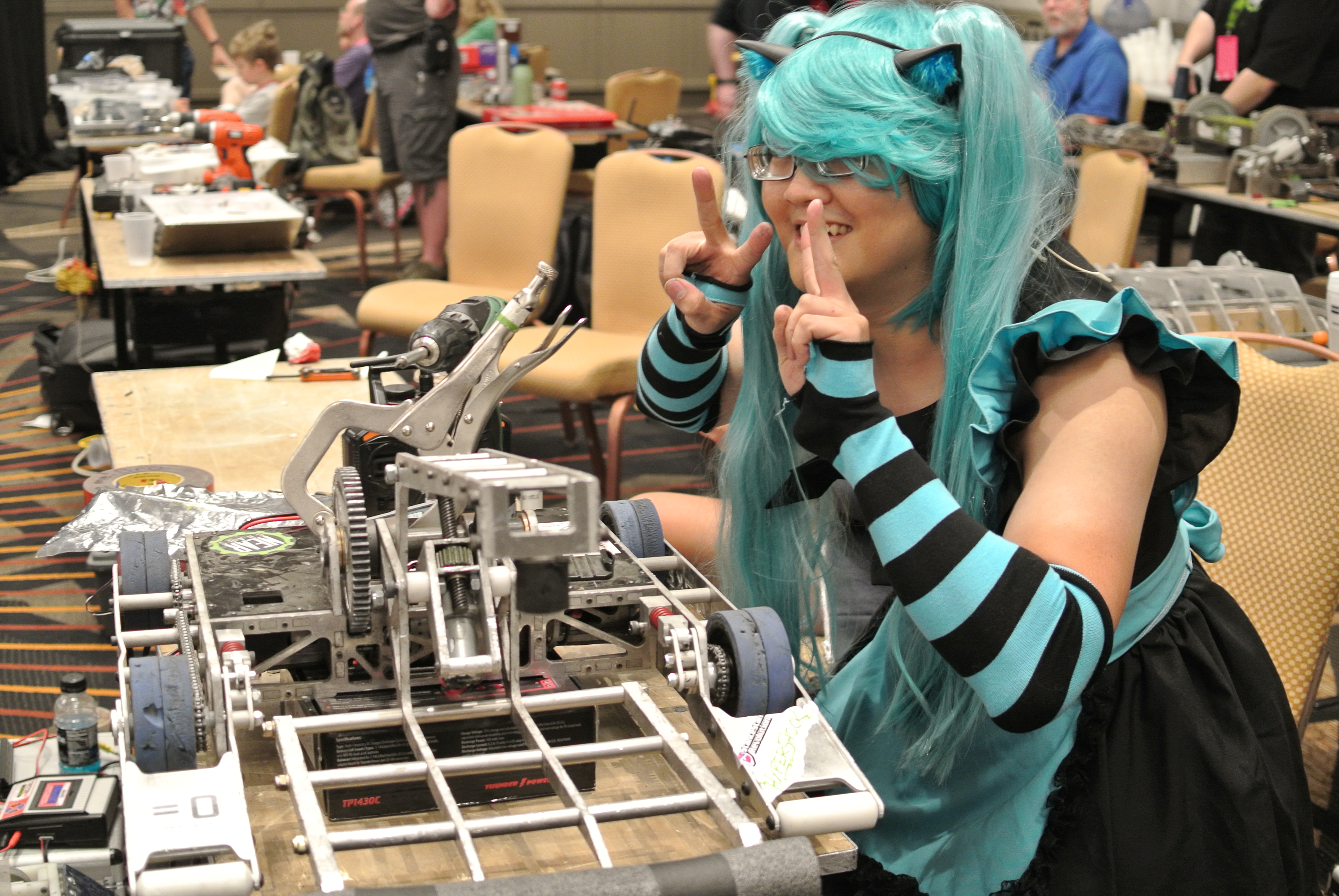 Lucy and I tag-teamed the controls during Dragoncon. I had the easy job of actuating the weapon while Lucy drove the bot. It looked pretty great with the two of us on a single controller. For our first match, we faced off against Styx from Near Chaos Robotics. We lost the first round, tied the second, and ultimately lost the third. We faced off with Charles for our last match and, as expected, he wiped the floor with us (though we did manage to tie in one round). It was in that match, unfortunately, that the weapon stopped working (possible motor or controller issues to be debugged). We were unable to regain movement of our weapon afterwards, but jumped immediately into the rumble for a final run (during which I drove for the fun of it and Charles won without being able to drive).